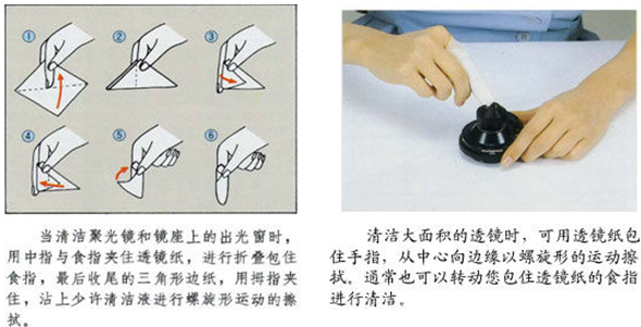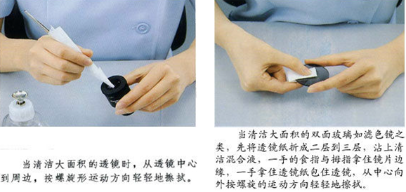 ??? 最好先用吹氣球或者吹氣槍先吹掉表面大的塵土顆粒,結(jié)合軟毛刷輕輕吹刷,因?yàn)檫@些顆粒往往容易劃傷鍍膜層,然后再用擦鏡紙醮取清潔液進(jìn)行擦拭。可參考如下圖例所示方法: