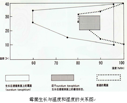 ??? 顯微鏡的光學(xué)表面都有防霉系統(tǒng),各個(gè)廠家都是采用化學(xué)藥品鍍膜防霉,一般有效期大約在7-8 年左右,超過(guò)8 年以后,防霉系統(tǒng)會(huì)失效,此時(shí),應(yīng)該找顯微鏡廠家重新安置防霉片,否則,實(shí)驗(yàn)室條件差的顯微鏡會(huì)開(kāi)始長(zhǎng)霉,南方潮濕地區(qū)特別顯著,霉菌會(huì)分泌有害物質(zhì)腐蝕玻璃表層的鍍膜層,霉菌密度大時(shí)危害特別大,這樣會(huì)嚴(yán)重危害顯微鏡的光學(xué)性能,因?yàn)殄兡邮枪鈱W(xué)顯微鏡性能的關(guān)鍵所在。上圖是霉菌生長(zhǎng)與溫度和濕度的關(guān)系圖(僅供參考)。