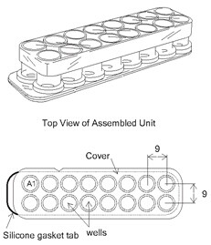 蓋玻片上的腔室共16個,分2排,各8孔(如圖示),每孔的內直徑6mm。設計的每孔體積和孔距與標準96孔板的相同,無細胞毒性的硅膠試劑壩(silicone well gasket)可以與上層聚苯乙烯材料的腔室(the upper structure,厚0.5mm)和基層的硼硅酸鹽蓋玻片(the substructure,厚0.16-.19mm)均形成密封。有上層腔室時每孔體積250µl,去掉上層腔室后每孔體積9µl。
