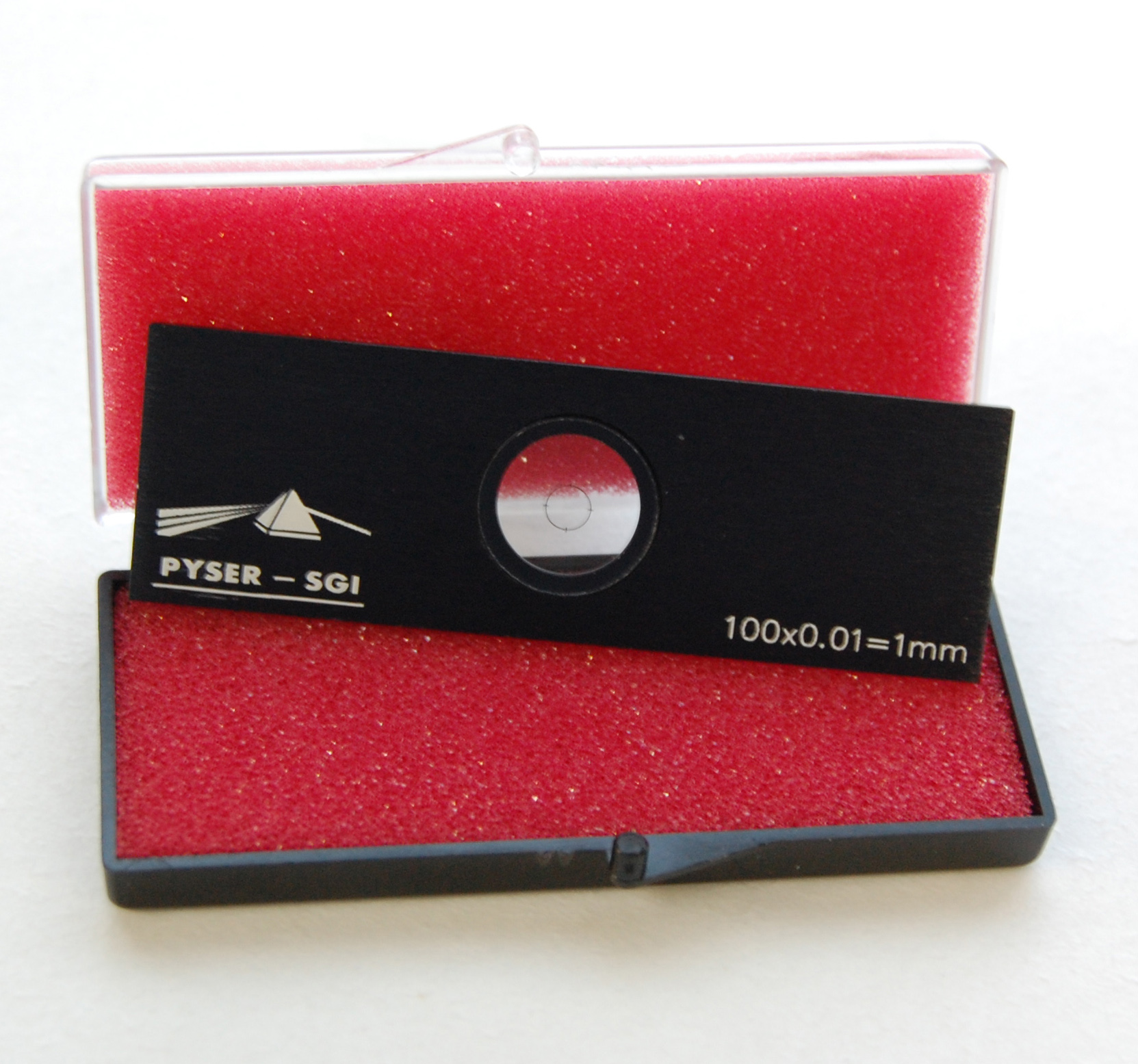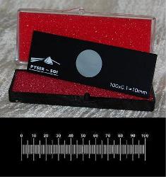 微尺一般是圓形,鑲嵌在一個黑色的陽極氧化鋁膜鍍層的載玻片內,載玻片尺寸:76mm x 25mm x 1.5mm。