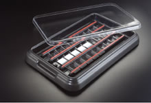 StrainTray的盒體呈黑色,由硬質ABS塑料制造,對廣泛的化學試劑均惰性(氯代烴類除外)。盒內支架有四個橫桿,玻片置于橫桿上,上面再壓上聚酯條,這樣可以很牢固的夾住玻片,盒體即使傾斜也沒有問題。橫桿之間的特殊設計可以防止液體飛濺。支架升高可以防水打濕玻片,另外升高的支架可以很方便的拿取玻片。盒體的底部有四個橡膠墊使其很穩(wěn)固地置于桌面上。盒子和盒子可以疊放,這樣可以節(jié)約很多空間。