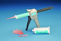 Sylgard 184硅橡膠(Kwik-Gard™Start Up kit)特別適合科學研究應用。可以省去混合兩種膠帶來的麻煩和時間的浪費。當推進注射器時自動在尖部混合,無任何氣泡,直接用于位點。更換尖端就可以重復使用,有效避免了浪費。每針筒含有37ml的硅膠樹脂和固化劑,針筒頭(tip)的體積0.75ml。針筒內的硅橡膠是Sylgard 184,液體組分組成的雙組分產品,包括硅膠組分與固化劑。硅膠組分與固化劑按10:1重量比完全混合,形成中等粘度混合液,混合液將固化成為具有韌性的透明彈性體,硅橡膠在25℃的溫度固化需要24h,無放熱現(xiàn)象,無需二次固化。