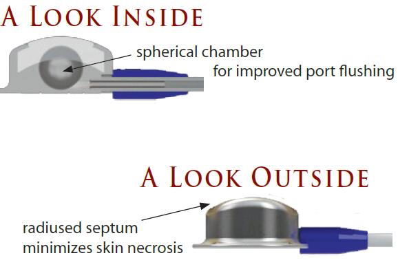三、SwirlPort:具有球形腔室的輸液港,SwirlPort為研究人員提供了新的輸液港技術,球形腔室的形狀消除了所有出現“潴留漿的角落,與類似大小的輸液港比較,減少了腔室整體體積。這種腔室的形狀已被證明對腔室沖洗體積有可測量的影響,該體積必須用來清潔”腔室的血液和藥物殘留量。與傳統端口相比,球形的腔室沖洗流量最低,且該流量與沖洗流速無關。目前可以提供三種大小:大-MAX(0.53ml);中-MID(0.33ml);小-MIN(0.18ml)。
