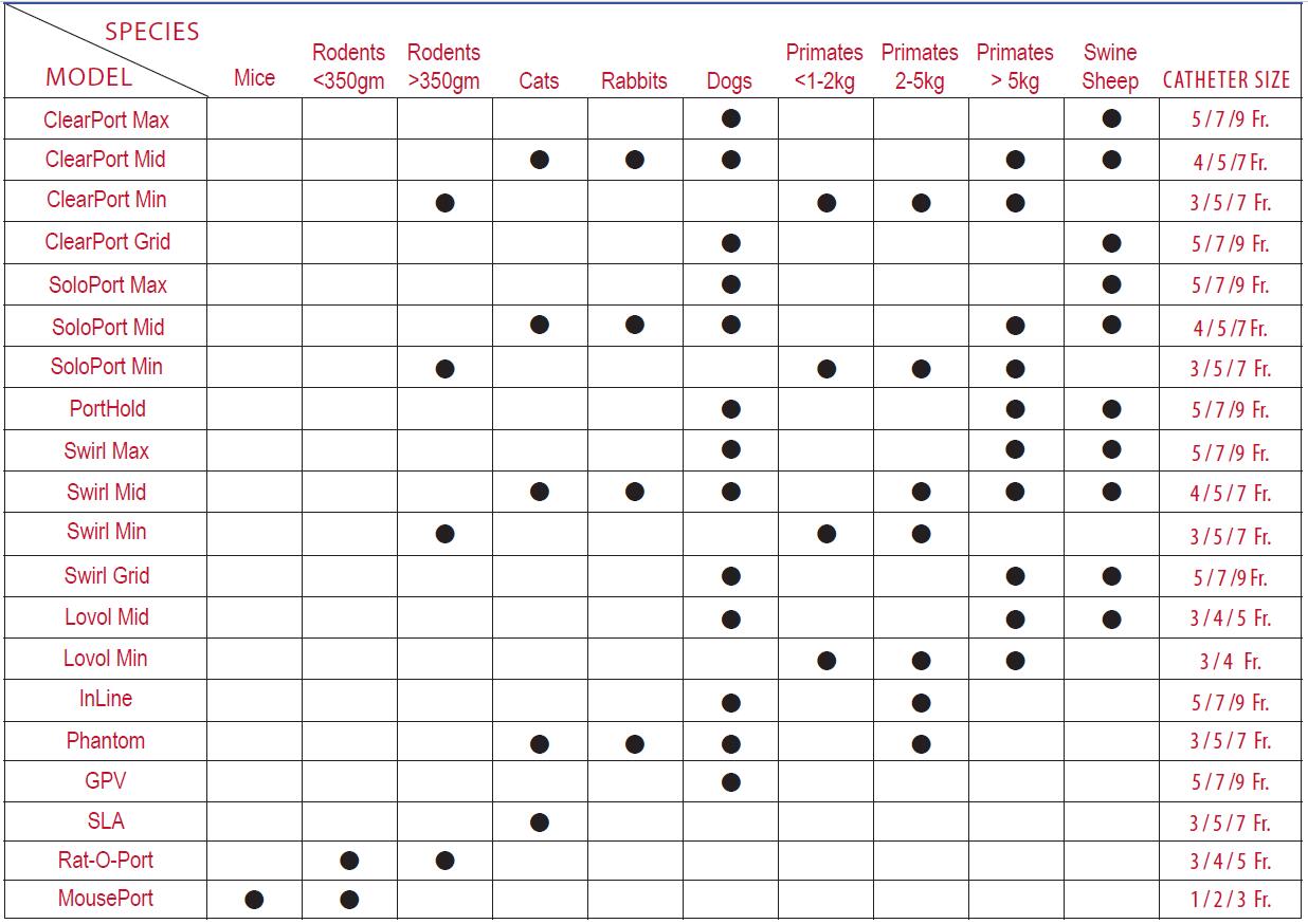 大小鼠用輸液港主要指適用范圍小于350g的鼠類(小鼠和大鼠)。對那些大于350g的大鼠、以及狗、貓、猴子等等,請選擇以下的注射座!產品一般是成套的,包含注射座和導管兩部分組成,往往會隨貨贈送一個針頭。具體的選擇可以參考下表以及產品的具體說明!