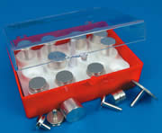 4.通用型銷釘型樣品臺盒:Pin mount storage box.。銷釘直徑為3.1mm的樣品臺均可以放置。里面有18個臺位(編碼1-18)。可以裝18個臺面直徑12.7mm的;或8個臺面直徑25mm;或2個32mm;或2個38mm;或2個50mm。