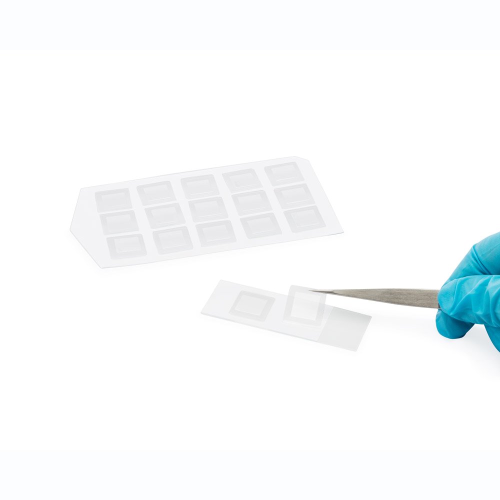 產品由上下兩部分構成:上層是No.1.5厚度的玻璃蓋玻片,下層是0.5mm厚度的透明硅膠片,無菌直接使用。設計上硅膠片較玻璃片略大,比如蓋玻片12*12mm大小,下方的硅膠片17*17mm大小,產品大小特別適于培養皿和培養板使用。包裝時,背襯底板是透明大塑料板,一板15個,一包有5板(共計75個)。