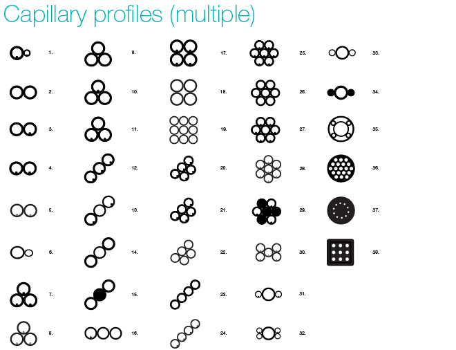 原產(chǎn)德國(guó)的多孔道毛細(xì)管,分為兩大類別,單管多孔道(single)和多管排列多孔道(multiple)。常見(jiàn)的圓形內(nèi)的多孔道排列,給出完美的幾何對(duì)稱,例如θ玻璃毛細(xì)管,這種對(duì)稱是毛細(xì)管中層流的產(chǎn)生所必需的,同時(shí)也能限制流動(dòng)。